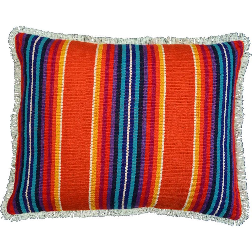 Add bright color to your decor when you use this Clarissa Jacquard Pillow on your sofa or chair. it displays various sized vertical stripes in bold colors such as tiger orange, cornflower blue, navy, violet, fuchsia, gold and bright white. A white fringe goes around the edges and completes the style of this pillow accent.