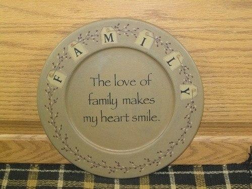 Your family will be reminded of the importance you place on them when you add this Love of Family wood plate to your decor. This plate measures 9" and features distressed painted wood and emphasizing the love of family with the words "The love of family make my heart smile" stenciled in the center of it! The outside of the plate has a berry vine border and tags that spell out FAMILY. This would look beautiful on a shelf in your living room or on a hutch in your kitchen to bring charm to your decor. Find other primitive styled decor to pair with it when you view our complete home decor section.